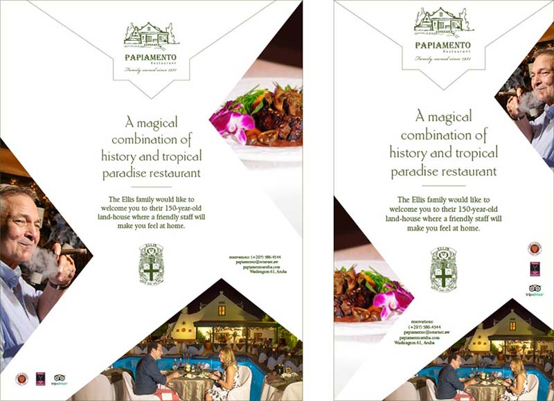 Onder Freeway hebben we een nieuwe stijl gecreëerd voor Papiamento Restaurant. Het restaurant is een 126 jaar oud Arubaans “cunucu” -huis en staat vol met prachtig antiek uit Europa, het oudste dateert uit het begin van de 19e eeuw. Het heeft ook zijn moderne uiterlijk en eten, dus we probeerden zowel de geschiedenis als het moderne te vangen in deze nieuwe advertentiestijl voor Papiamento Restaurant.